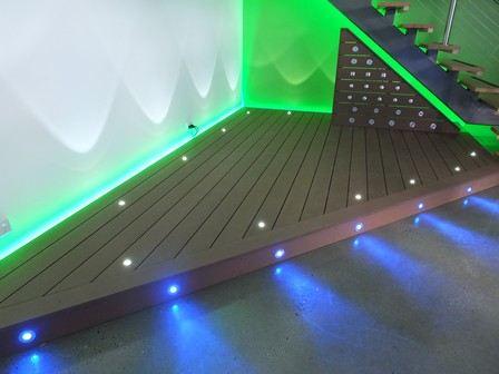 Because Hybrideck can be worked with exactly the same tools as timber it is very easy to install lights into your decking as shown in the pictures included in this article.  If you are building a new deck  it is the best time to install suitable wiring and power supply. This work is always best completed by a qualified electrician. If your Hybrideck is already installed using the Hybrideck hidden fixing system you have the luxury of being able to easily retro fit Led lighting.  Your Hybrideck can easily be removed by unscrewing the hidden fastening clips and lifting the decking boards to gain access to install your wiring for power supply to your new decking lighting. Of course your Hybrideck will not get damaged if you carefully unscrew the fastening system and can be reinstalled after your wiring is in place. You can also install you LED strip lights in the same manner. Be sure to centre your lights in the middle of your Hybrideck boards so the finish will look as balanced as possible. For further information regarding installing lighting into your decking please press on the following link.  Hybrideck contact details